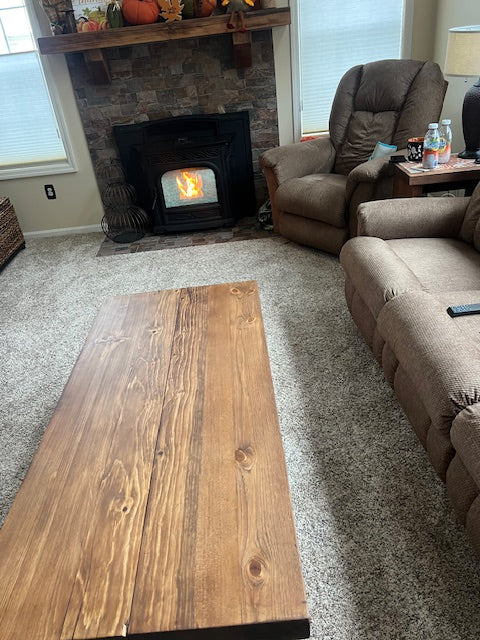 - Coffee Table Top: 26"W x 54"L x 3"T resembling photo #CT032 made with a real wood beams.