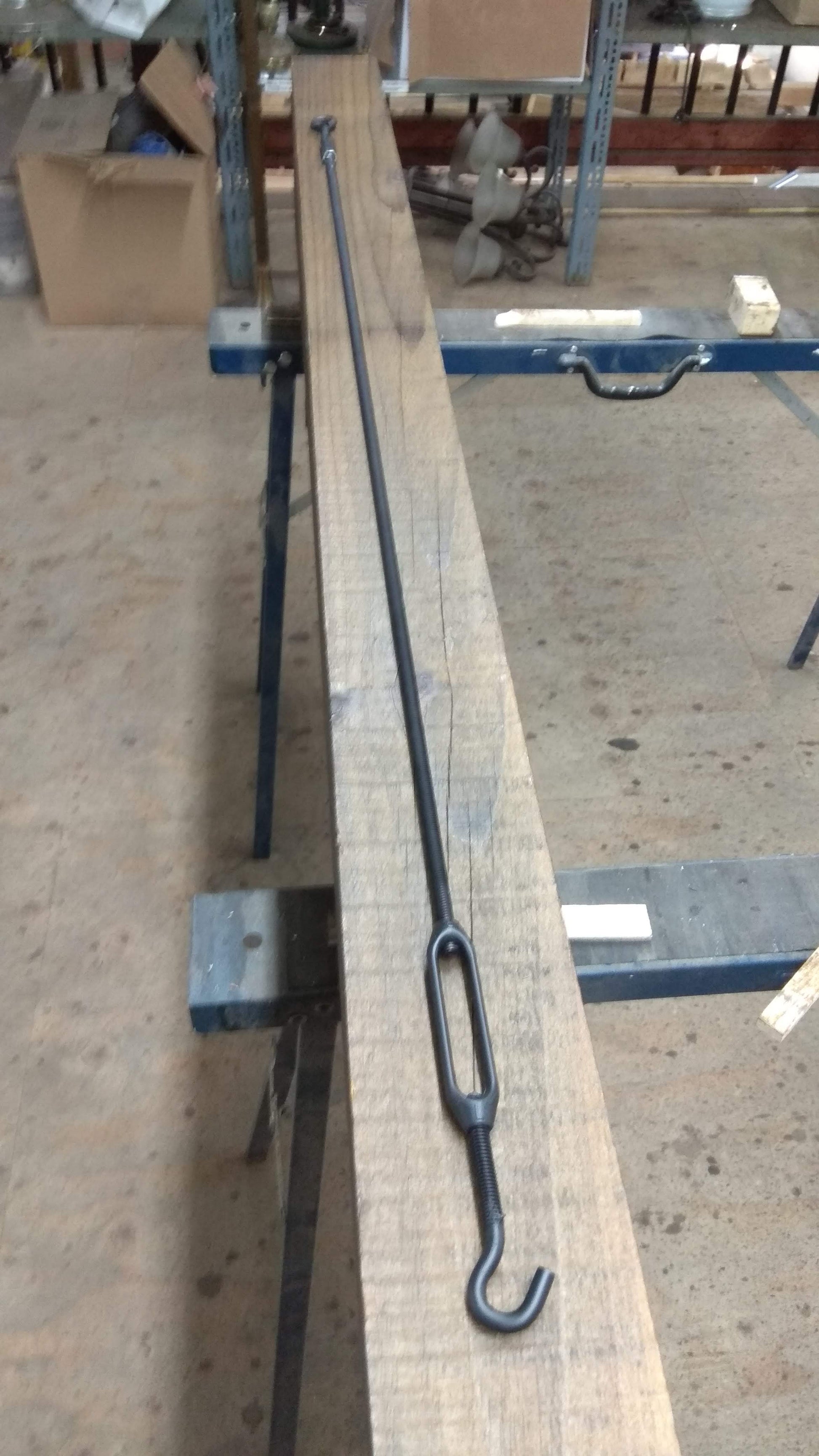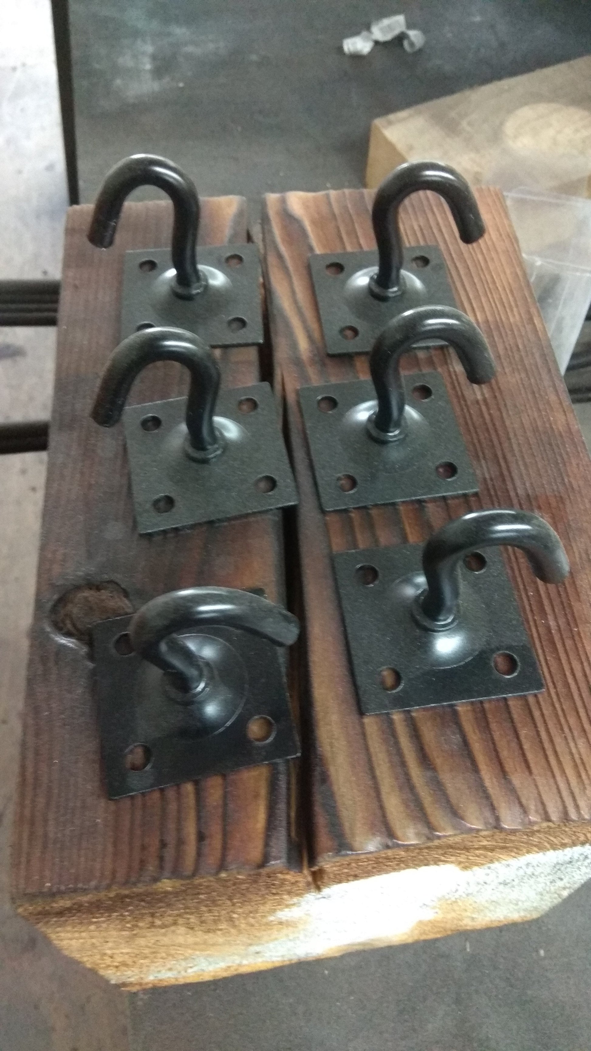 - Two big black iron U brackets with hooks and old style square head black forged lag screws and washers.